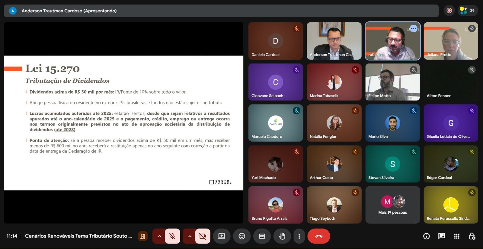 Nesta edição, o foco esteve nas mudanças recentes do sistema tributário brasileiro e nos impactos que a Reforma Tributária pode gerar sobre o setor de energia. O encontro ocorreu em formato on-line e reuniu associados interessados em compreender como as novas regras podem afetar investimentos, projetos em desenvolvimento e a estruturação de negócios no segmento energético.